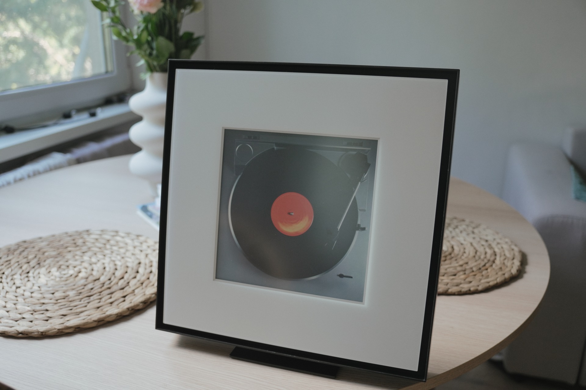 La câțiva ani distanță vine și Samsung cu Music Frame care îmbină aceeași idee de boxă Wi-Fi cu un design atrăgător de tablou. Ce avantaj are Music Frame asupra Symfonisk? În primul rând, e mult mai ușor să schimbi aspectul boxei și o poți face mai des. Poți scoate rama albă, iar apoi poți înlocui imaginea din centru cu alta. În pachet este inclusă această imagine cu un vinil și un pickup și mai ai una de rezervă cu forme geometrice. Însă poți printa orice altă imagine dorești cu tine, cu un partener sau animal de companie.