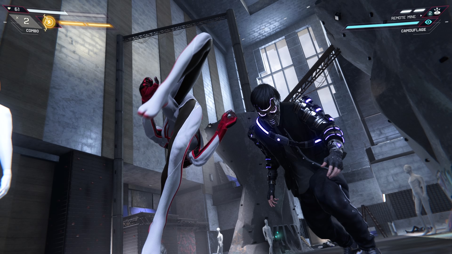 La fel ca și în trecut, experiența cumulată te ajută să crești în level, apoi să atribui puncte anumitor abilități. Ai posibilitatea să deblochezi costume, schimbându-ți look-ul, dar și anumite caracteristici (-25% mai puțin damage de la atacurile de la distanță). Frumusețea este că jocul nu te blochează într-un anumit costum și poți să schimbi acele caracteristici. Apoi mai ai la dispoziție patru gadgeturi de care te ajuți în luptă. Ce este nou: abilitățile de bioelectricitate ale lui Miles, atacuri devastatoare împotriva grupărilor de inamici, dar și a boșilor. Ca să le folosești trebuie să lovești adversari și fiecare combo încarcă abilitatea.