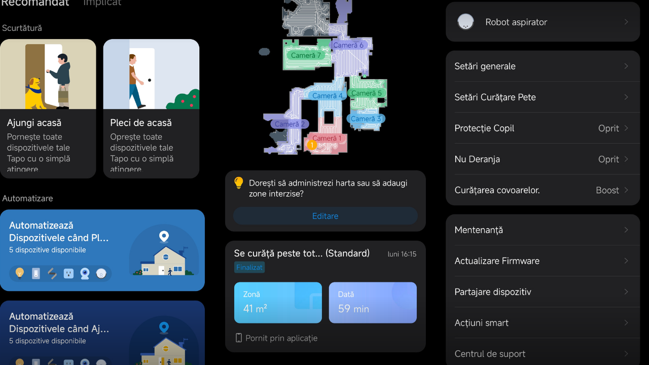 Ce îmi place la aspirator este faptul că poți să-l programezi să pornească automat în anumite zile, ore, dar și că poți să-i spui să nu treacă în anumite zone unde poate ar avea probleme. Integrată în ecosistemul Tapo, robotul poate fi activat automat după plecarea utilizatorului din casă sau când sunt conectați anumiți senzori (detecție mișcare, deschidere ușă etc.).