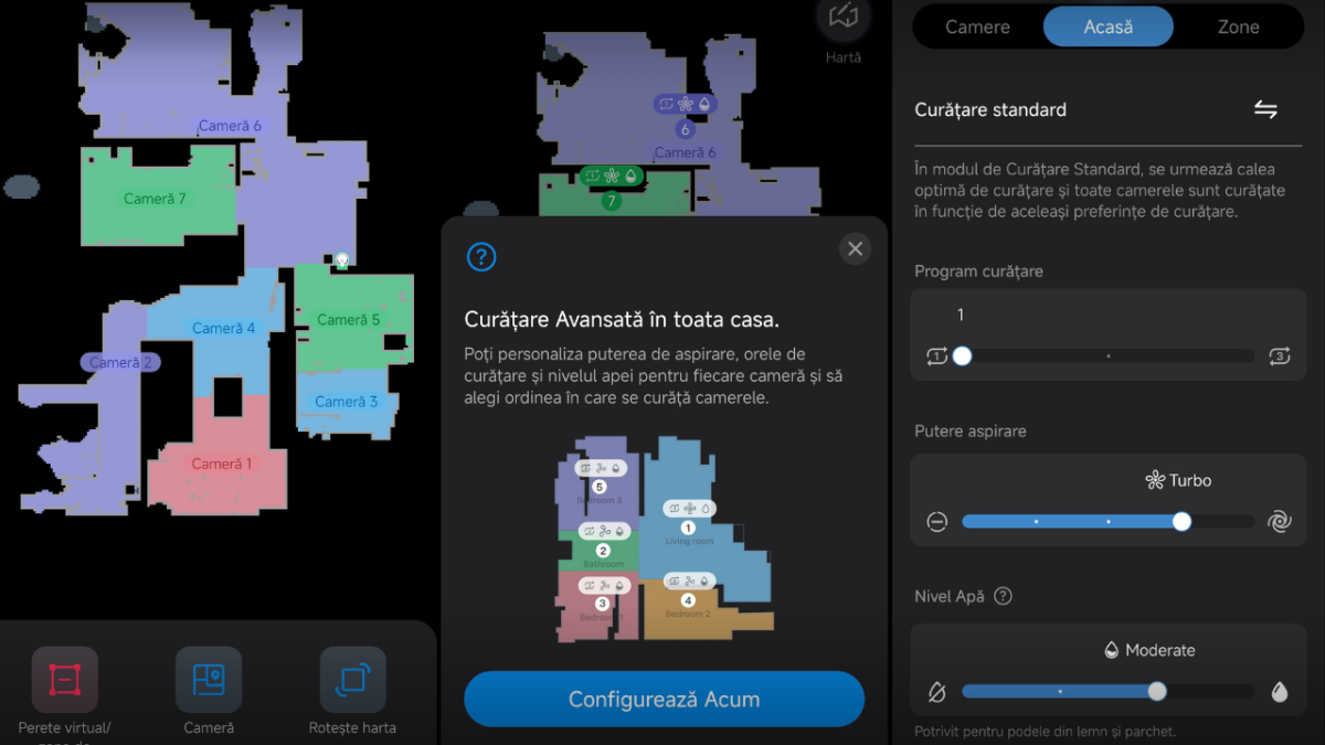 După cartografiere, fiecare cameră este denumită manual sau automat în aplicație. E amuzant că sufrageria a împărțit-o în două camerele, la fel și biroul meu pentru că într-o parte am un covor și în alta nu am. Se pot seta programe de curățare programată (zilnic, săptămânal, per cameră sau pe zone), ore diferite, moduri multiple de aspirare/mopare pe fiecare spațiu în parte. Poți limita accesul în anumite zone, desenând direct pe hartă "no-mop" sau "no-go zones" – util pentru covoare sau colțuri cu prize. Deoarece, spre deosebire de modele mult mai scumpe, acesta nu știe să ocolească cablurile lăsate pe jos și chiar la prima folosire s-a încurcat în unele.