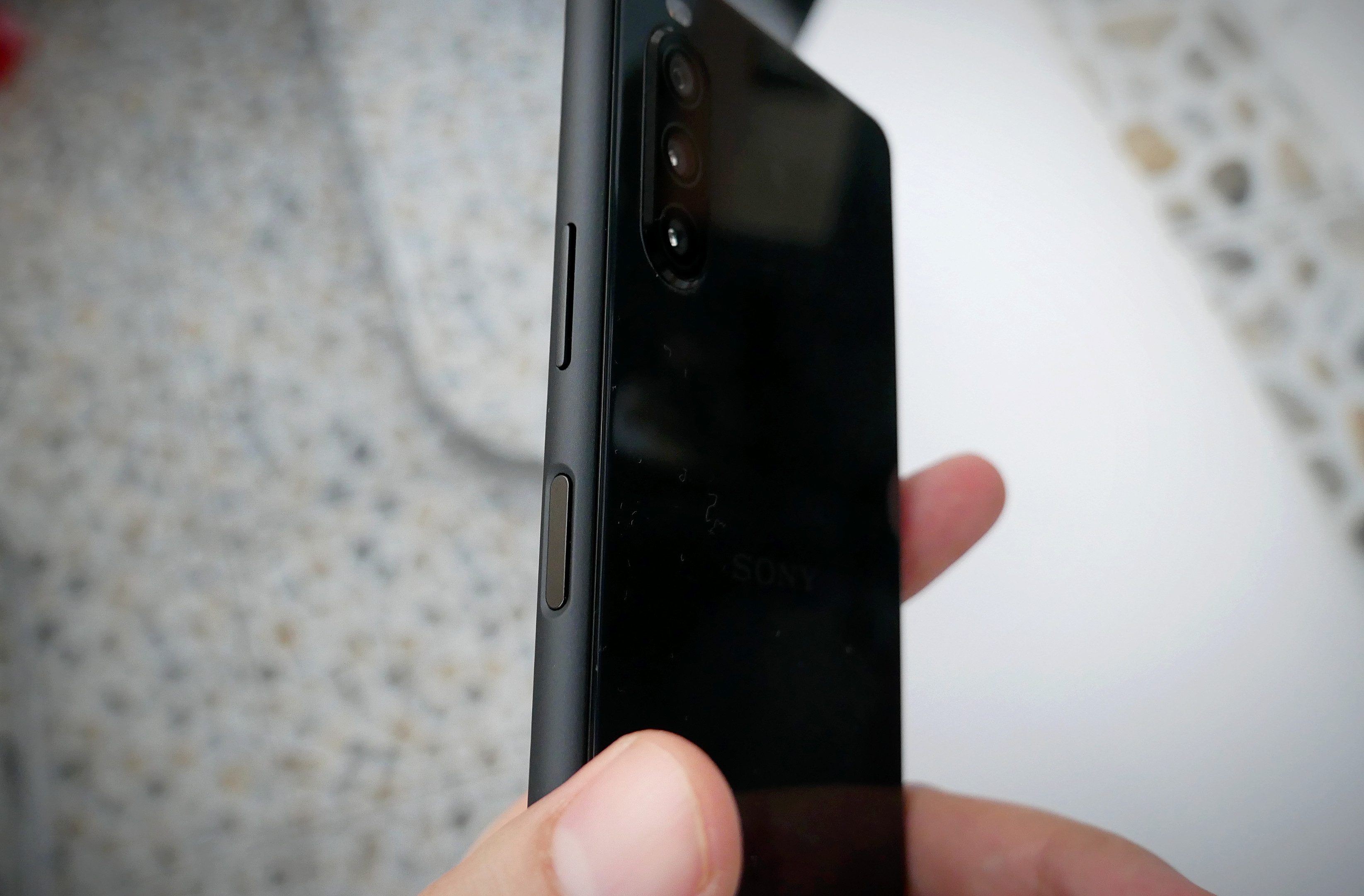 Pe laterale avem butoanele obișnuite, iar cel de power care funcționează și ca senzor de amprentă. Marginea telefonului este realizată dintr-un plastic frumos finisat, iar în partea de sus găsim o mufă de căști și jos un port de încărcare USB-C.