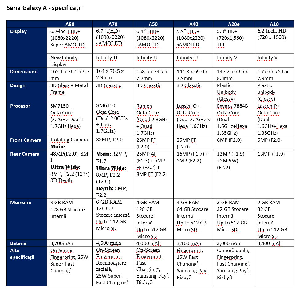 Fiind formată din șase device-uri, noua serie Galaxy A permite utilizatorilor să aleagă telefonul care se potrivește cel mai bine stilului lor de viață și bugetului de care dispun. Indiferent dacă vrei ecranul cel mai mare și contrastul cel mai bun de culori, o cameră care să surprindă cadre ultra-wide sau o durată de viață a bateriei ridicată, astfel încât să nu îți faci griji cu încărcarea lui, seria Galaxy A le oferă pe toate.