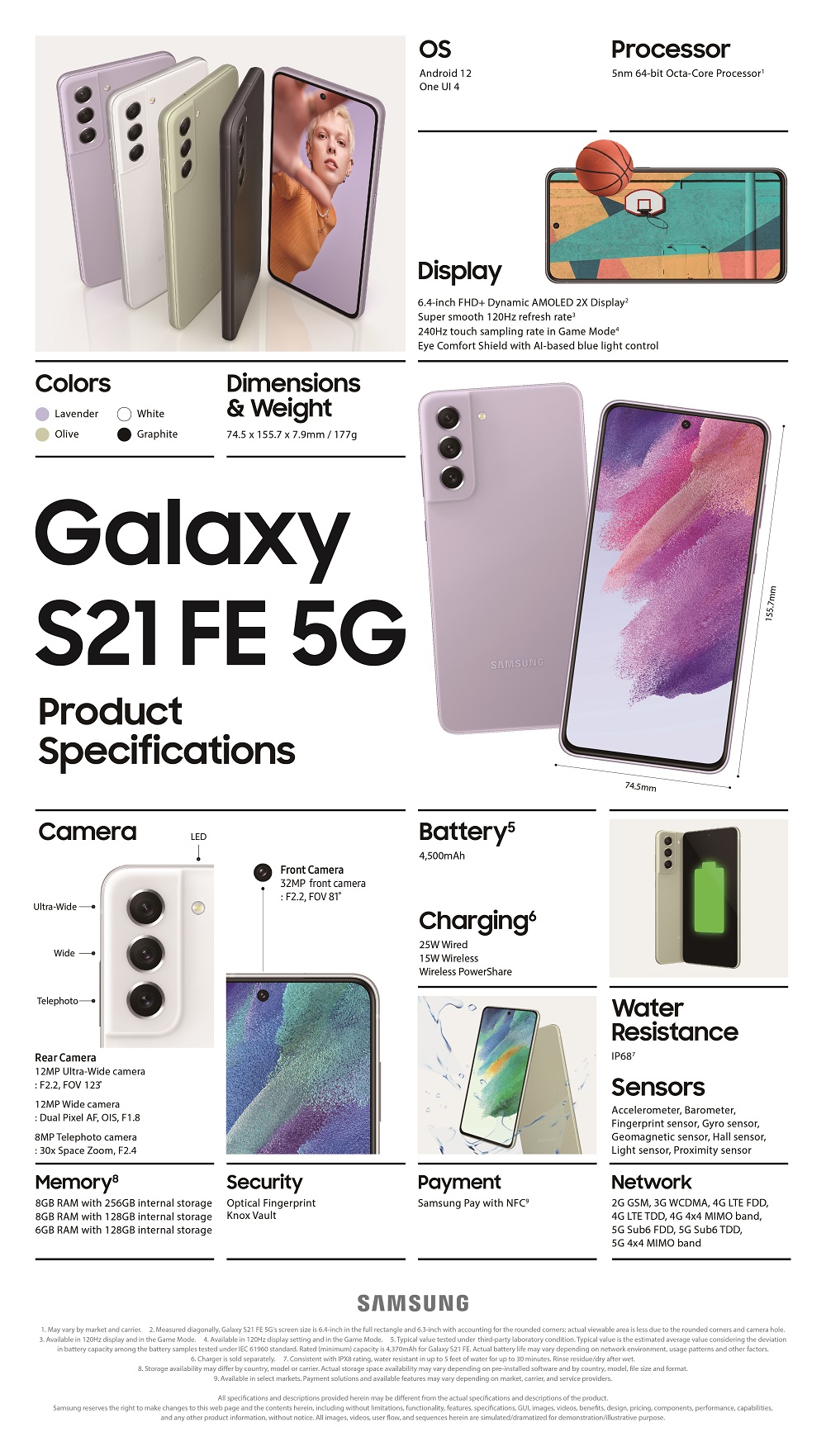 Noul S21 FE 5G vine cu un design premium, caracteristic seriei Galaxy S21; cadrul iconic, cu un contur bine definit, preferat de fanii Samsung, se integrează perfect cu camera S21 FE 5G și oferă un aspect elegant și unitar. Samsung le oferă consumatorilor mai multe modalități de a se exprima cu patru opțiuni de culoare noi — Olive, Lavender, White sau Graphite — ce includ un finisaj elegant de culoare mată. Galaxy S21 FE 5G are un design elegant și subțire, cu o grosime de 7,9 mm, astfel încât să fie ușor de ținut în buzunar.