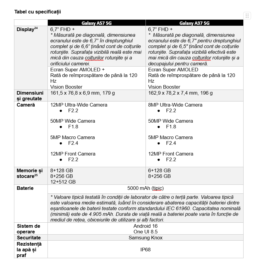 Noile modele rulează Android 16 cu One UI 8.5 și vor fi disponibile din 10 aprilie pe anumite piețe. Galaxy A57 5G vine în culorile Awesome Navy, Awesome Gray, Awesome Icyblue și Awesome Lilac, iar Galaxy A37 5G în Awesome Lavender, Awesome Charcoal, Awesome Graygreen și Awesome White.