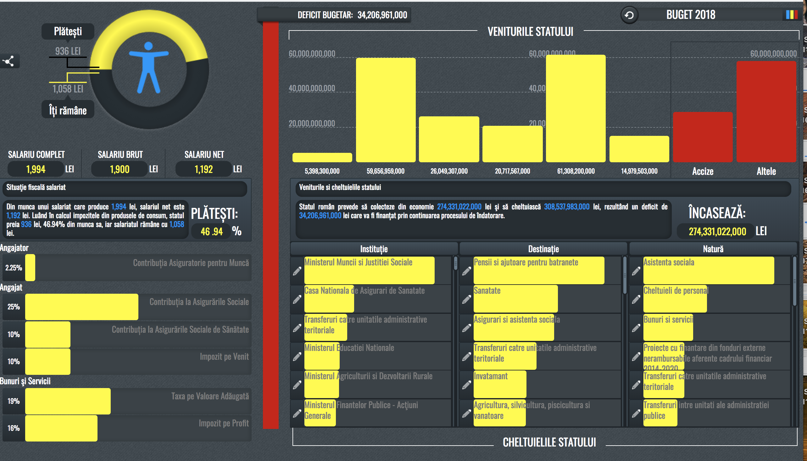 Cu ajutorul platformei Open Budget, poți să vezi unde se duc banii tăi cu exactitate, în funcție de salariul net și salariul brut. Introduci salariul tău, iar platforma calculează automat cât plătești și cât rămâne la tine.