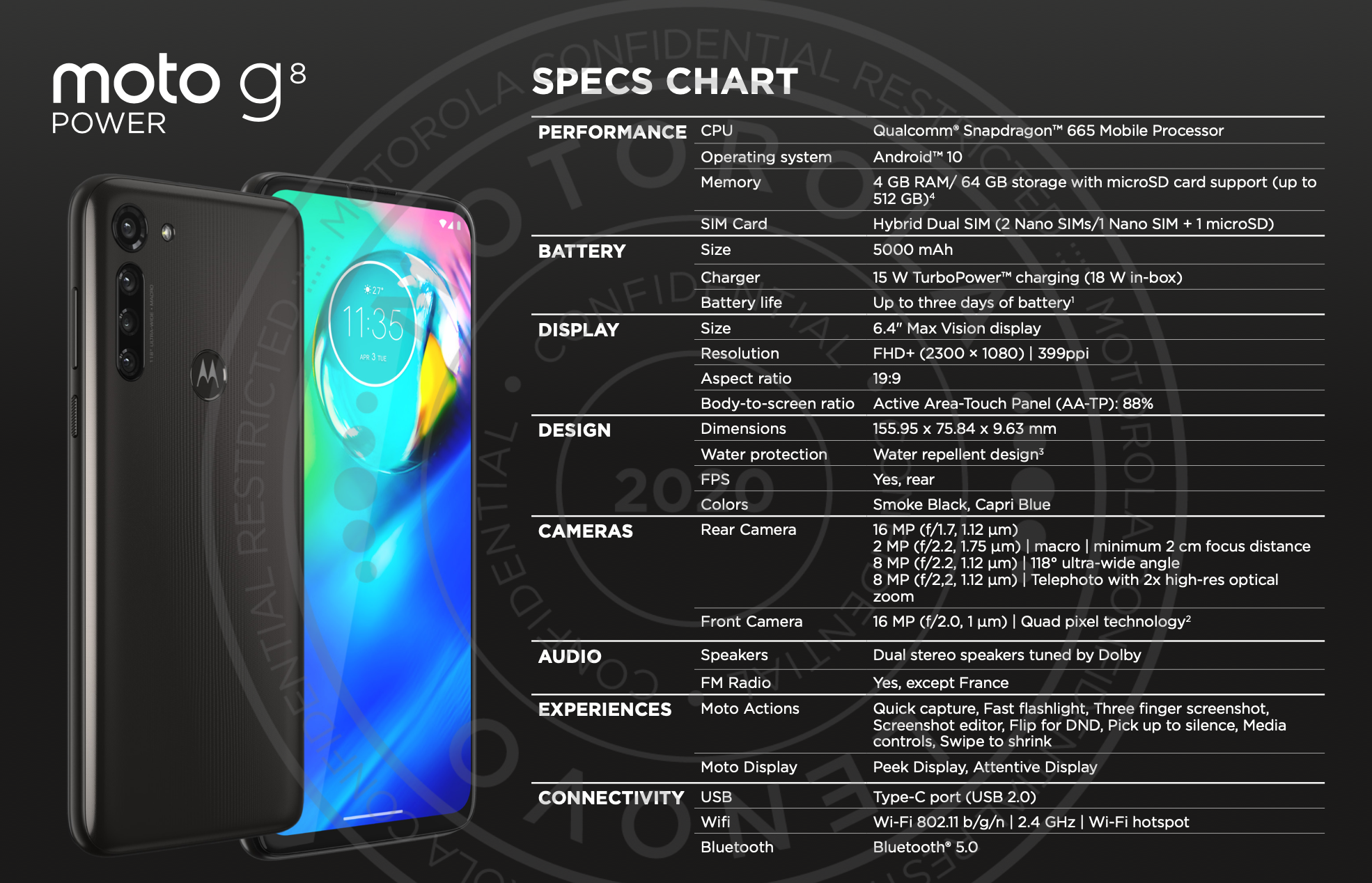 Ecranul are o dimensiune de 6,4 inci. Dispozitivul se bucură și de un design rezistent la apă, procesor octa-core Qualcomm Snapdragon 665 și 4 GB RAM, 64 GB spațiu de stocare, interacțiunile exclusive Moto Experiences și cu o versiune Android 10 curată, fără bloatware.