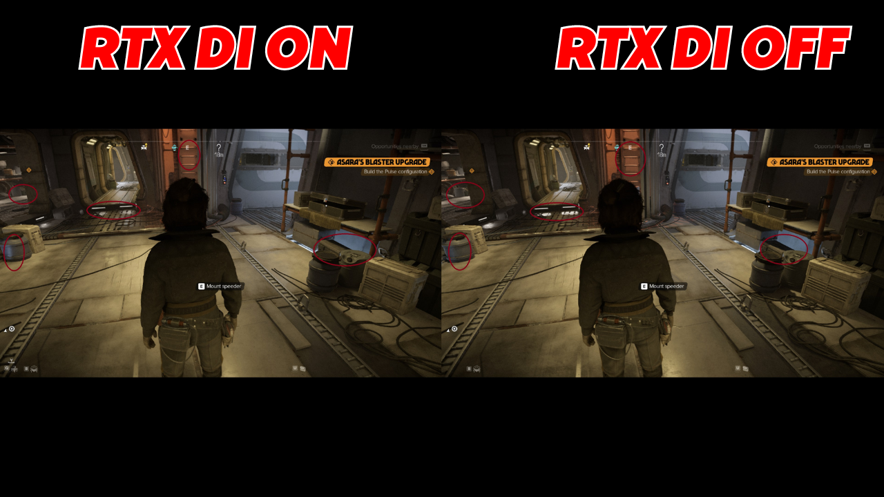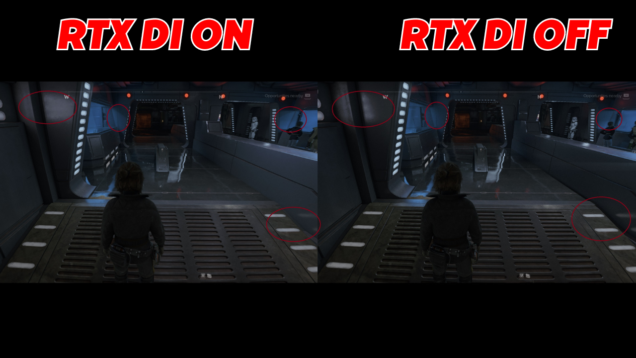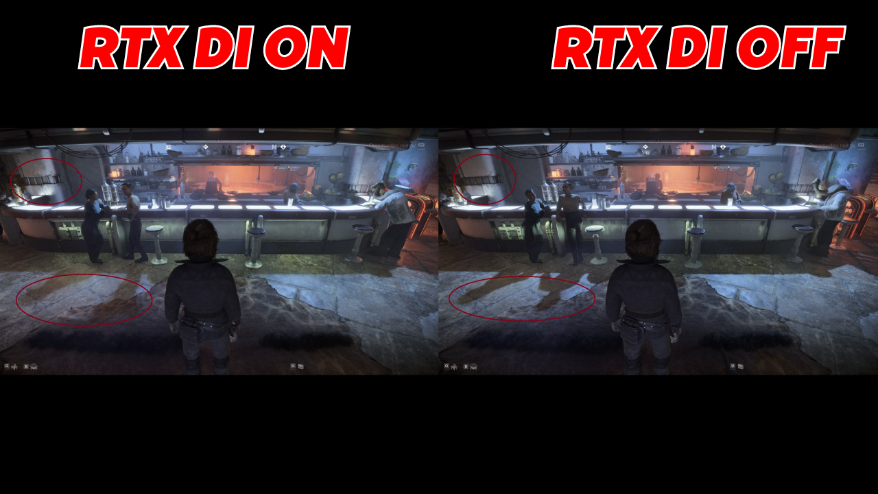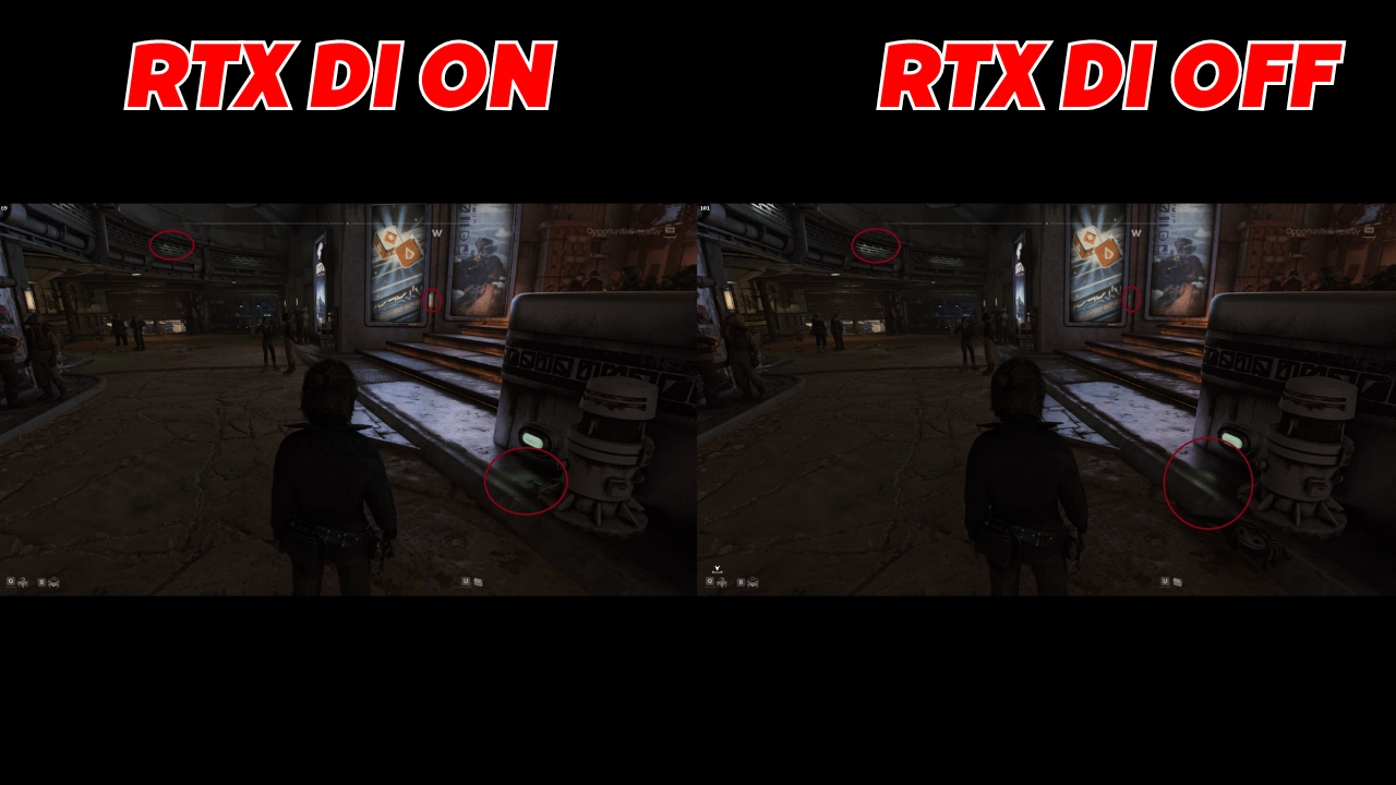 Tehnologia care adaugă un mare plus din punct de vedere vizual este RTX Direct Illumination, care face ca luminile și umbrele să fie ray traced. Asta înseamnă că jocul poate simula mai bine umbrele, dimensiunea și forma luminii, fie naturală de la soare, fie de la surse artificiale. Fără RTX DI umbrele sunt prea clare și prea bine delimitate și nu au acea difuzie pe care o vedem în realitate. Însă cu această tehnologie activată din setări putem vedea umbre mult mai naturale și care se estompează cu cât de îndepărtezi de sursa de lumină.