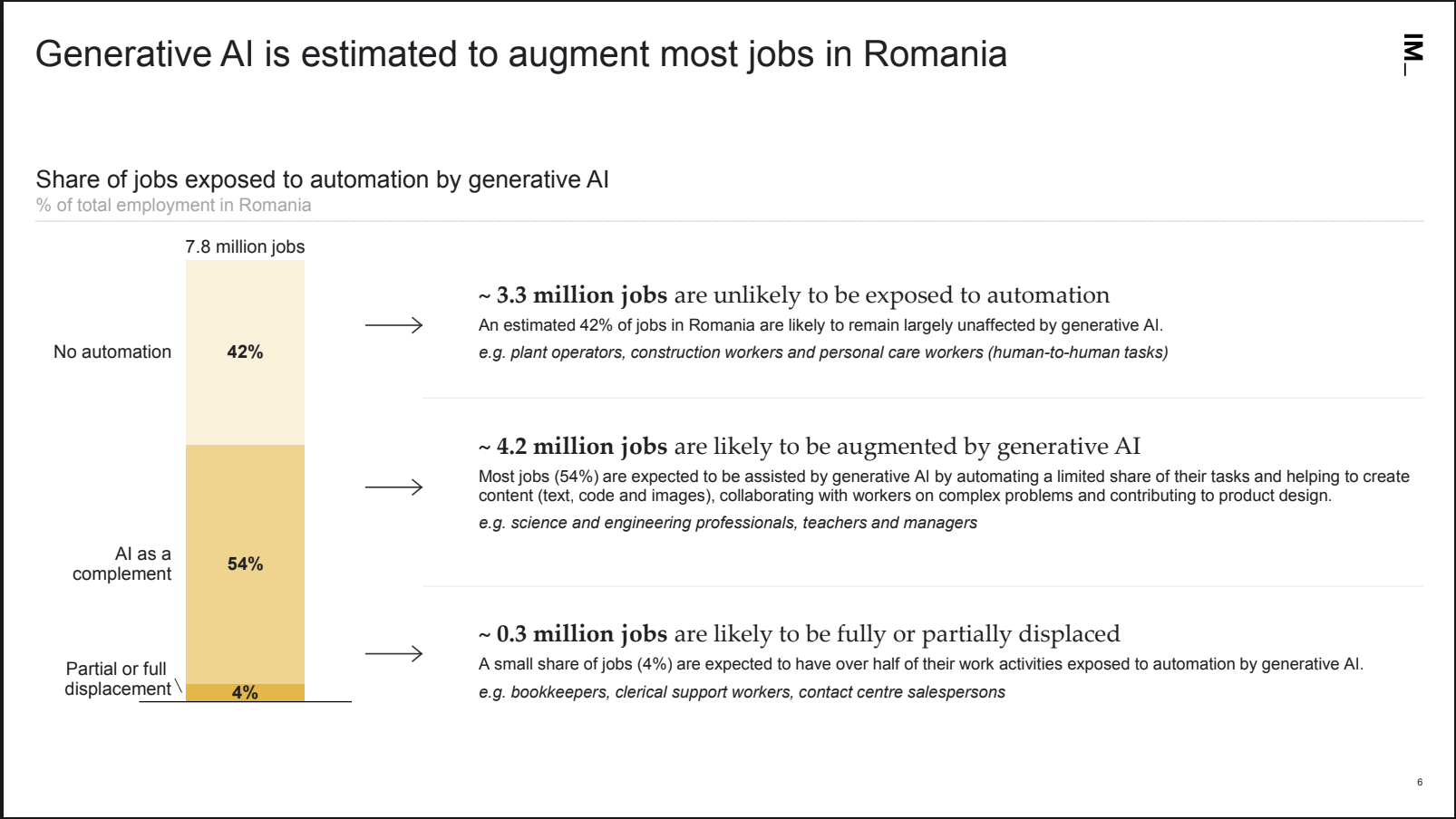 Implicațiile asupra locurilor de muncă: În total, se estimează că inteligența artificială generativă va avea un impact asupra a până la 4,5 milioane de locuri de muncă din România. Se așteaptă ca AI-ul să aducă îmbunătățiri în cazul a peste jumătate dintre locurile de muncă din România (54% sau 4,2 milioane), prin automatizarea unei părți limitate din sarcinile acestora și prin ajutorul oferit în crearea de conținut (text, cod și imagini), prin susținerea acestora în rezolvarea a unor probleme complexe și contribuind la designul produselor. În cazul unei mici părți a locurilor de muncă din România (4% sau 0,3 milioane), peste jumătate din sarcini ar putea fi automatizate prin utilizarea inteligenței artificiale generativă. Cu toate acestea, se așteaptă ca noile locuri de muncă în economia bazată pe inteligență artificială să le înlocuiască pe cele pierdute în urma automatizării. Aproximativ 42% dintre locurile de muncă din România nu vor fi afectate de adopția AI-ului, arată studiul.