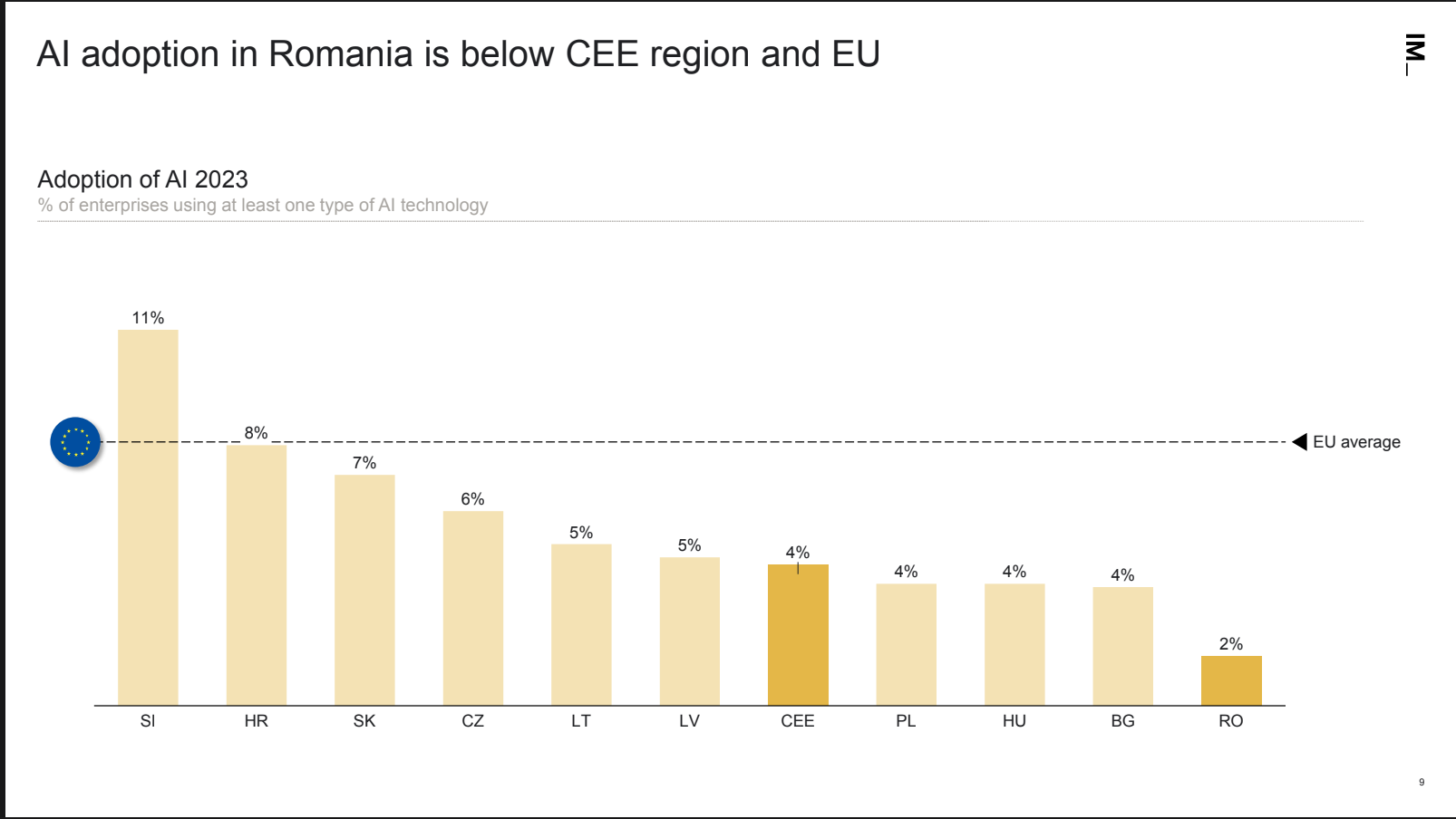 Gradul de pregătire în AI: Studiul Google arată că doar 4% dintre companiile din CEE și 2% dintre cele din România au adoptat cel puțin un tip de tehnologie AI în 2023, față de media de 8% în UE. Cu toate acestea, 40% dintre întreprinderile din România plănuiesc să investească în automatizarea bazată pe AI în următorii cinci ani. Principalul obstacol în calea adoptării AI, menționat de 61% dintre companiile din CEE, este costul instrumentelor AI. În ansamblu, CEE este în urma mediei UE și a liderilor globali pe toți factorii de adoptare și trebuie să valorifice beneficiile AI prin strategii guvernamentale direcționate, investiții în abilități și educație în domeniu, sprijin pentru inovația locală și inițiativele comerciale în domeniul AI.