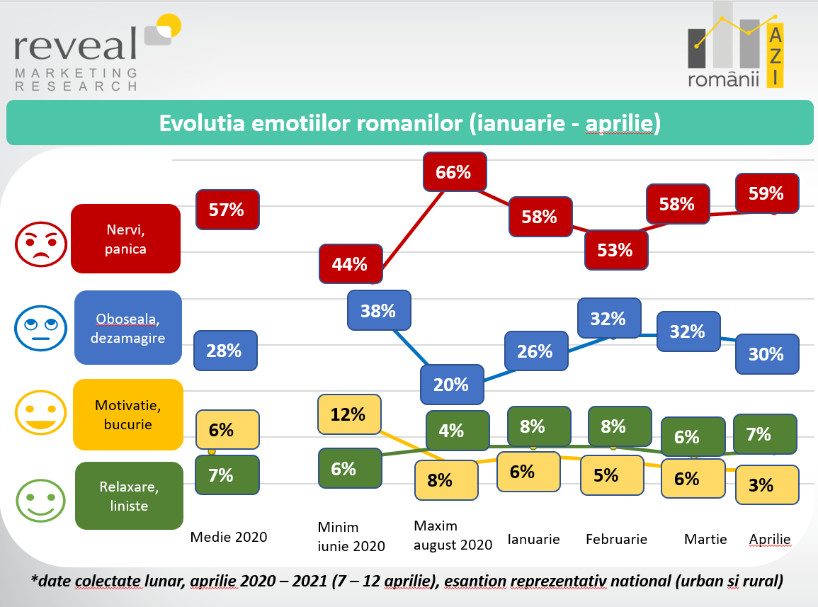 Desi satisfacția generală fața de diverse aspecte ale vieții a crescut în aceasta luna, nivelul de furie se menține ca în martie, în schimb scade puțin nivelul de oboseală al românilor. Nivelul de motivație din această lună înregistrează cele mai scăzute procente (3%) din acest an și din 2020. Emoțiile cele mai resimțite în luna aprilie sunt cele de îngrijorare (13%) și de dezamăgire (12%).