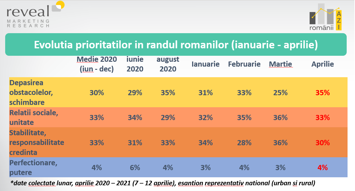 Pe primul loc în aprilie se află teritoriul depășirii obstacolelor și al schimbării, cu o creștere de 10% față de luna martie. Această lună înregistrează cele mai ridicate procente din acest an, probabil datorită nevoii românilor de a schimba ceva în viață lor după un an de pandemie, de restricții și de distanțare socială. Teritoriul relațiilor sociale și al unității trece pe locul doi în motivațiile românilor în această luna, cu o scădere de 3% comparativ cu martie.
