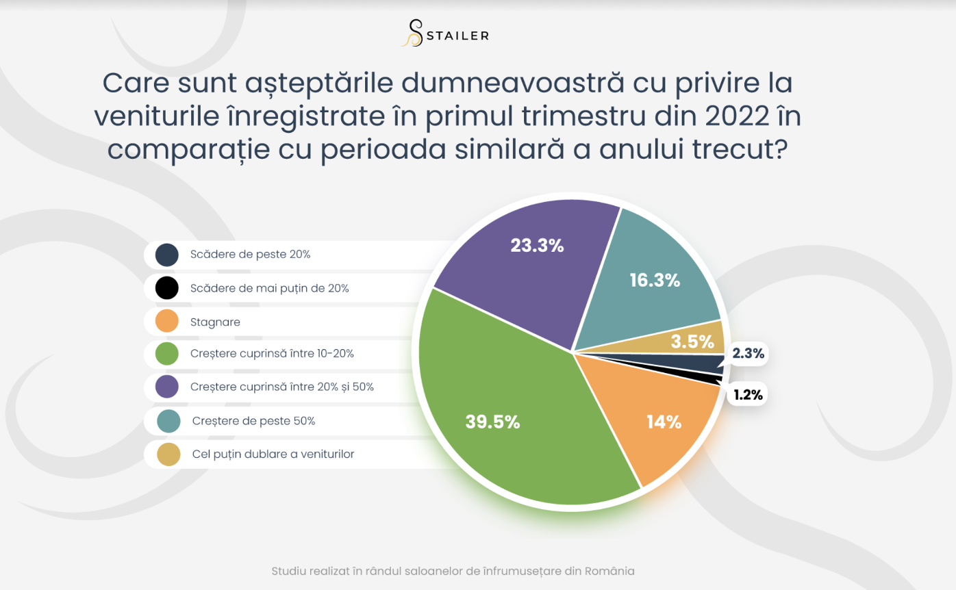 Mai mult de jumătate (61,6%) dintre saloanele de înfrumusețare și barbershop au raportat o creștere a veniturilor în 2021, în revenire față de anul 2020, în timp ce pentru 12,8% între unități afacerile au fost în stagnare, iar 26,6% dintre saloanele chestionate de Stailer au înregistrat scăderi ale încasărilor.
