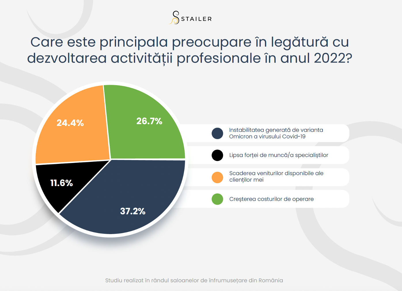 Instabilitatea generată de varianta Omicron a virusului Covid-19 este principala preocupare în legătură cu dezvoltarea activității saloanelor de înfrumusețare (37,2%), fiind urmată de presiunea creșterii costurilor de operare și scăderea veniturilor disponibile ale clienților, care reprezintă o problemă prioritară pentru 26,7%, respectiv 24,4% dintre saloane de înfrumusețare. Lipsa forței de muncă și a specialiștilor reprezintă o preocupare principală pentru 11,6% dintre respondenții studiului realizat de Stailer.
