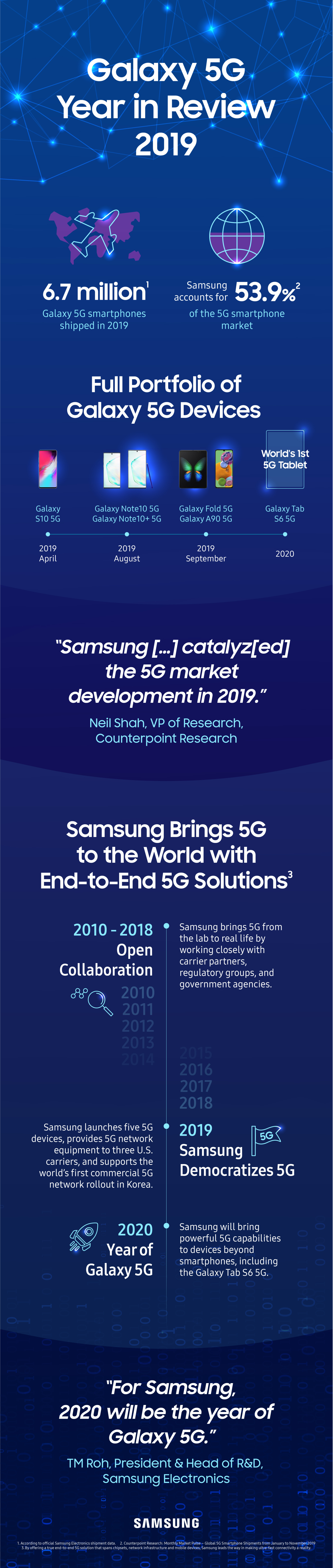 Samsung livrează cinci device-uri Galaxy 5G la nivel global, inclusiv Galaxy S10 5G, Galaxy Note10 5G și Note10+ 5G, precum și Galaxy A90 5G și Galaxy Fold 5G, lansate recent.