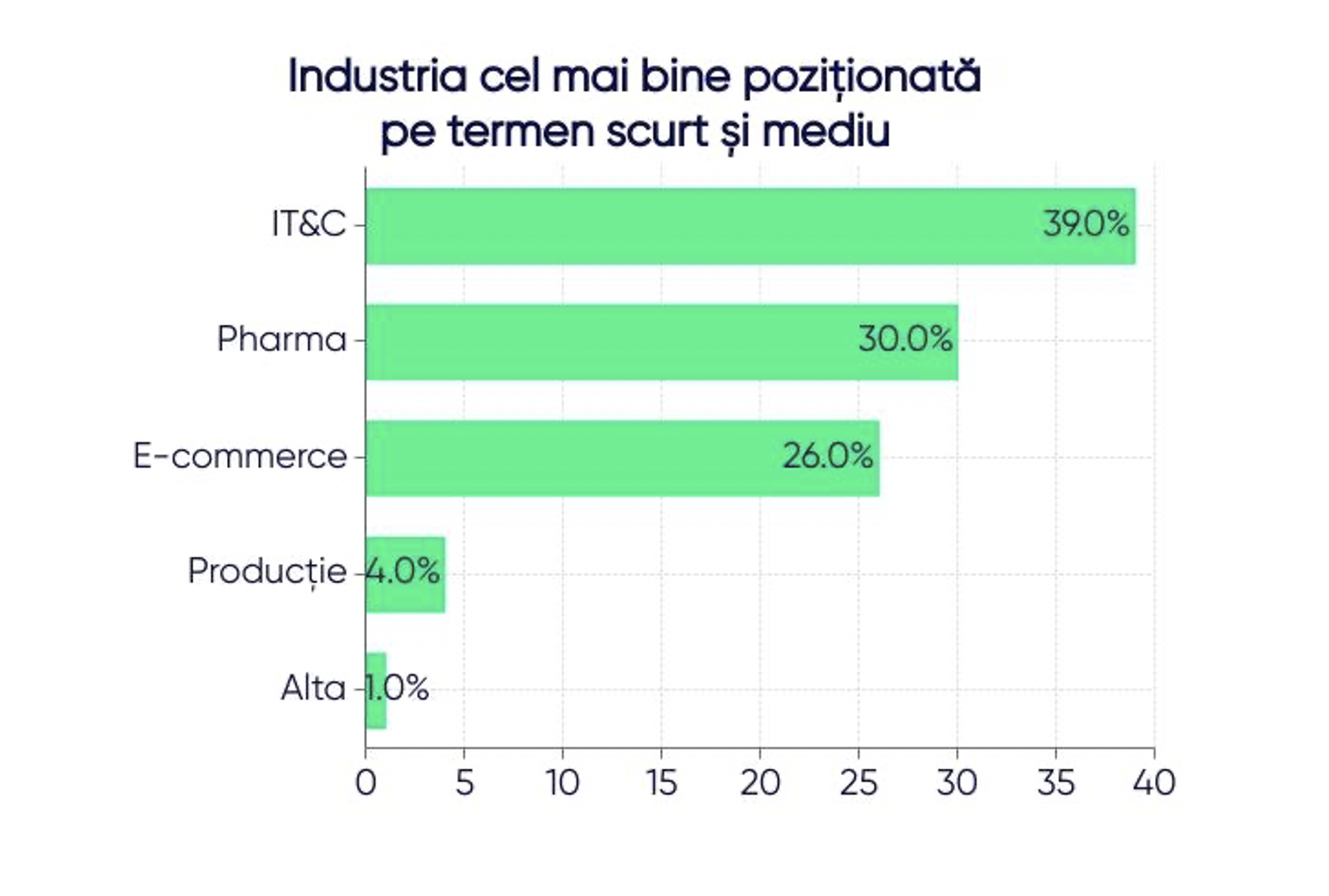 Din perspectiva oportunităților de business în contextul crizei COVID-19, 39% dintre antreprenori și manageri cred că sectorul IT&C este industria cel mai bine poziționată pe termen scurt și mediu în România, fiind urmată de pharma (30% dintre respondenți) și e-commerce (26%).