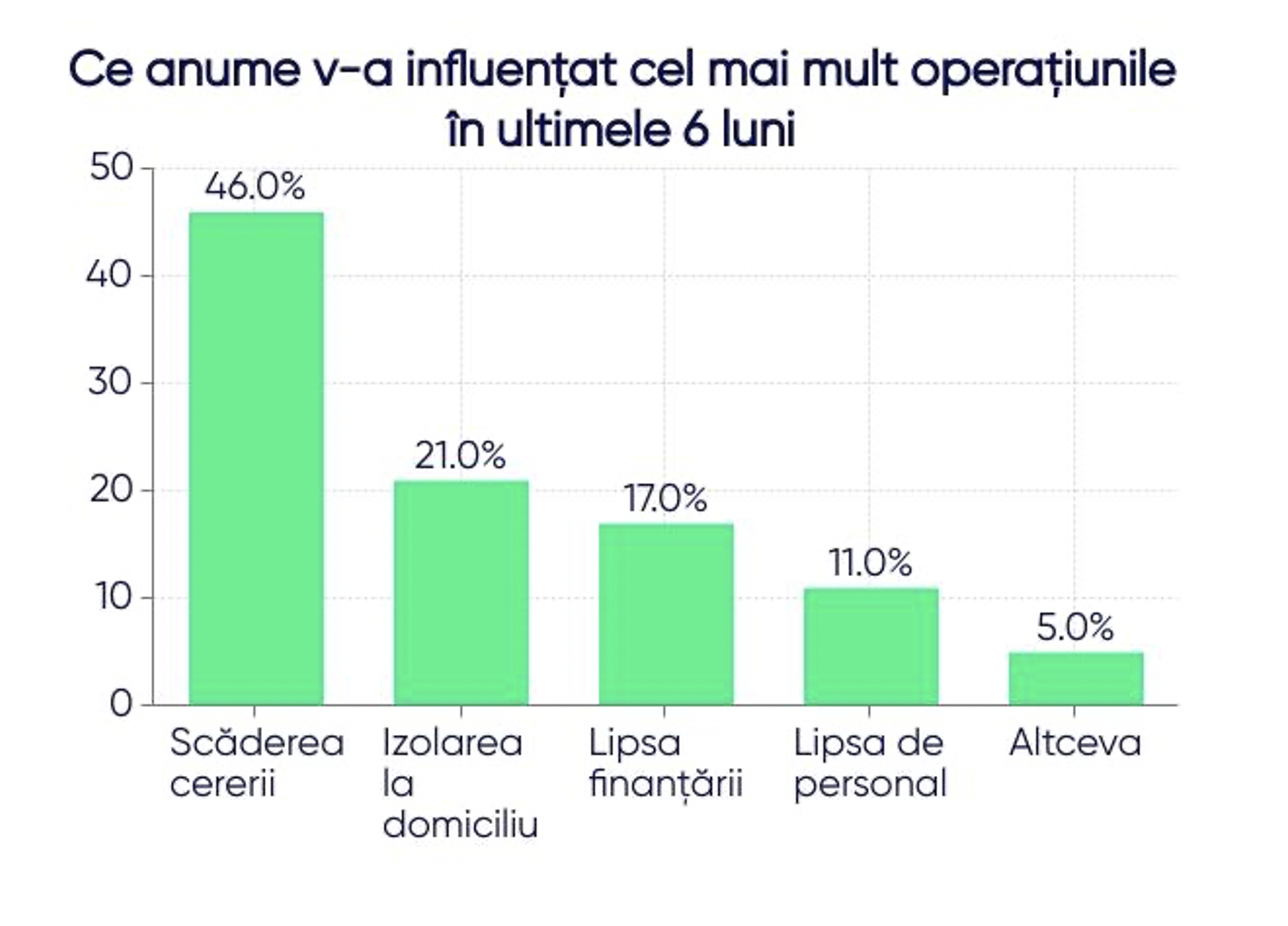 La întrebarea „Ce anume v-a influențat cel mai mult operațiunile în ultimele 6 luni, în contextul Crizei COVID-19”, 46% dintre administratorii firmelor au ales „scăderea cererii”. Pentru 21% dintre firme, cea mai mare presiune a fost cauzată de izolarea la domiciliu din cauza lock-down-ului generalizat, iar 17% au fost impactați mai ales de lipsa unor resurse de finanțare.