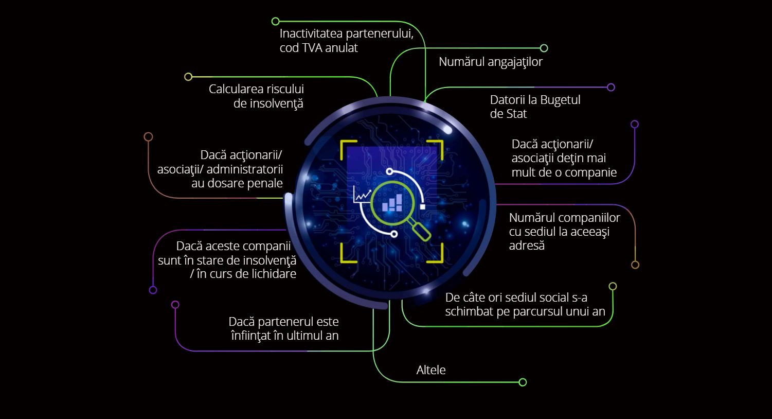 PartnerSCAN app processes the state authorities’ public databases information provided by Termene.ro by using an algorithm designed by Deloitte specialists based on the European Union Court of Justice decisions and on their extensive practice. The algorithm assigns scores to 18 indicators relevant for assessing the fiscal risk, including partner inactivity, canceled VAT code, the risk of insolvency, debt to the state budget, number of employees, age of the company. Also, the application takes into account if shareholders or administrators hold similar positions in insolvent or liquidated companies, number of companies headquartered at the same address or how many times the registered office has changed over one year.