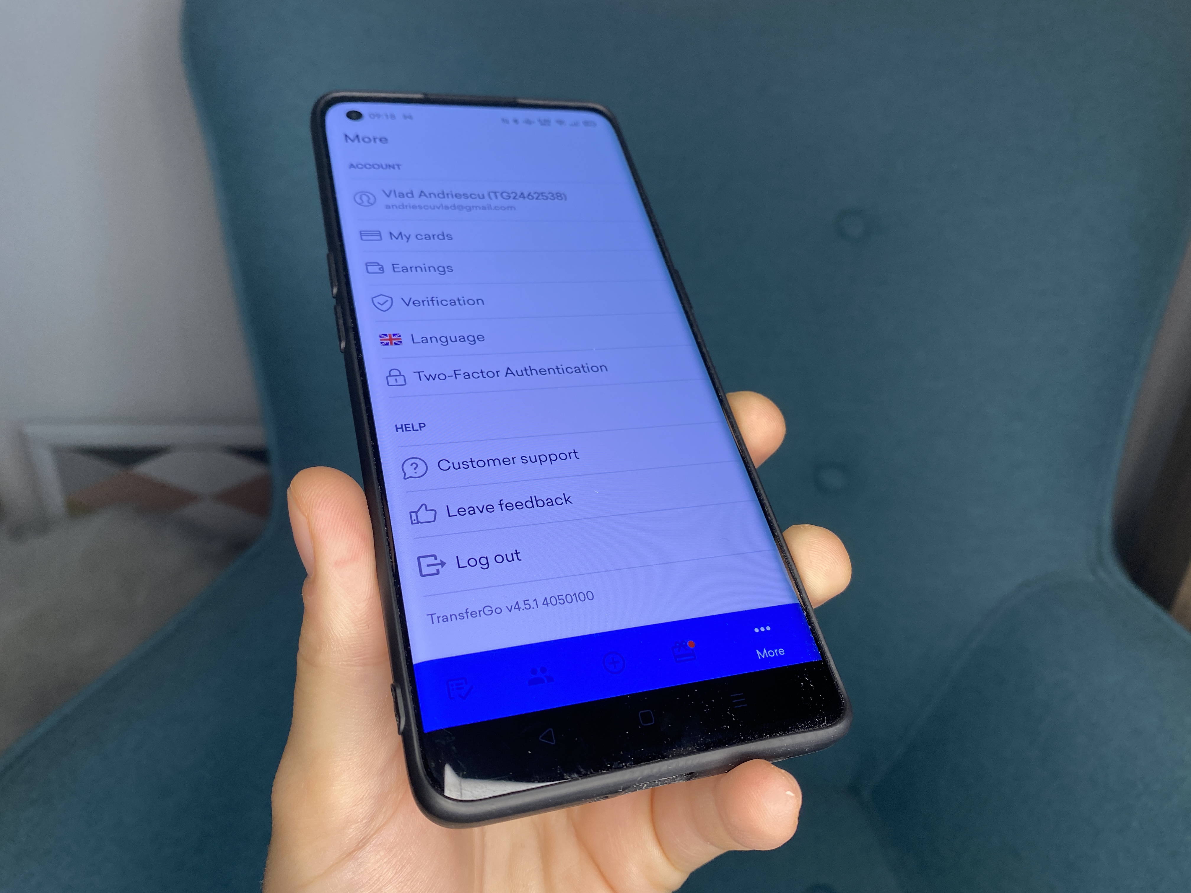 3. Poți să te duci direct la transfer, dar te sfătuim ca mai întâi din meniul „Mai Mult” să alegi limba preferată și să adaugi cardul din care se va face transferul sau pe care vei putea primi bani în aplicație.