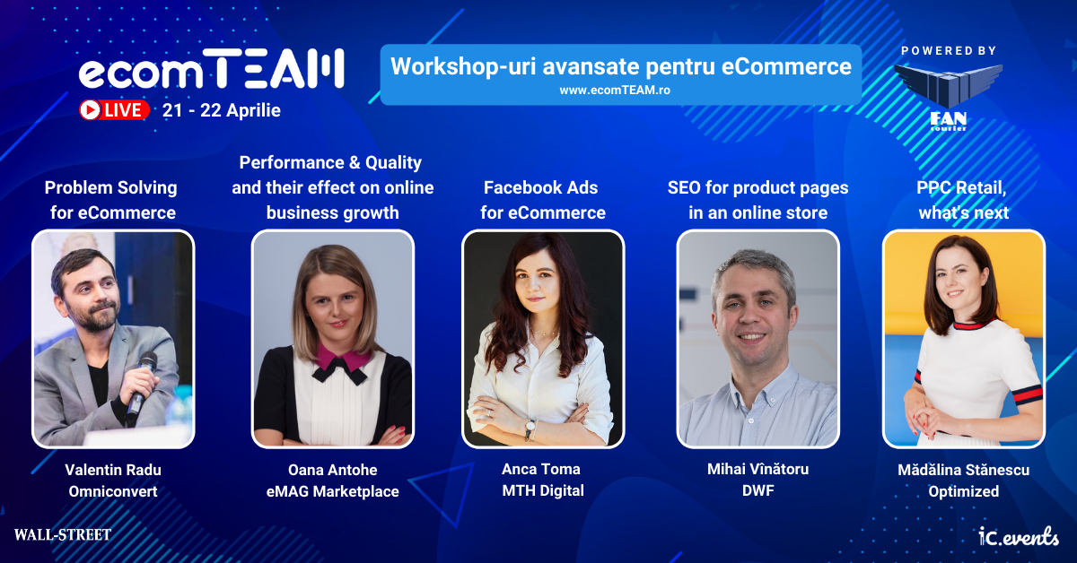 Cinci workshop-uri de excepție, susținute de experți cu o activitate bogată în spate, te așteaptă la ecomTEAM! Workshop-urile ecomTEAM se adresează în special celor care cunosc deja destul de bine domeniile, aducând în mod clar plus valoare magazinelor online și specialiștilor care participă.