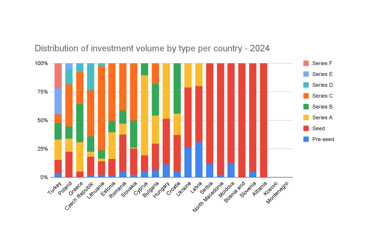 - Concentrarea investițiilor în anumite țări: Cele mai mari investiții din Europa de Est s-au concentrat în țări precum Turcia (1,012 miliarde de euro), Polonia (592 de milioane de euro), Grecia (536 milioane de euro) și Cehia (426 milioane de euro). Această concentrare sugerează că aceste țări au ecosisteme mai dezvoltate și mai atractive pentru investitori, ceea ce poate influența direcția investițiilor viitoare.
