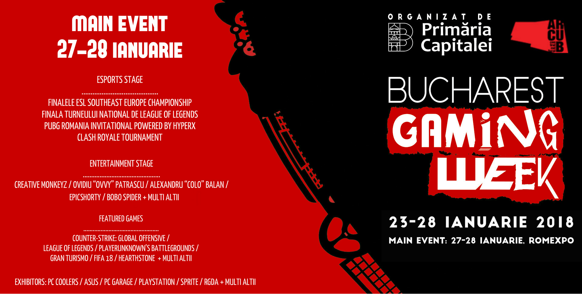- Bucharest Gaming Week – Evenimentul central (27-28 ianuarie) – Un weekend plin de spectacole, activități și turnee esports pentru comunitatea de gaming din România.